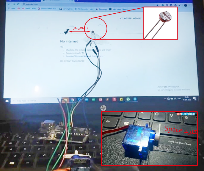 گوگل کروم را بر روی کامپیوتر باز کنید. اینترنت را قطع کنید تا بازی بر روی مانیتور ظاهر شود. فتوسل را با چسب نواری در فاصله ۱ سانتیمتری مقابل دایناسور بچسبانید. سروو موتور را هم روی کلید فاصله (space) کیبورد بچسبانید: