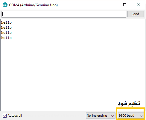 با اجرای این برنامه: کلمه hello بعد از هر 1000 میلی ثانیه (یک ثانیه) یک بار روی «سریال مانیتور» نوشته میشود.