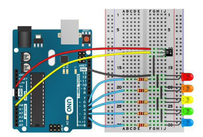 هر ال ای دی دارای یک پایه مثبت و یک پایه منفی است. پایه منفی کوتاهتر است. طبق شکل زیر پایه ها را روی برد نصب و به آردوینو وصل کنید: