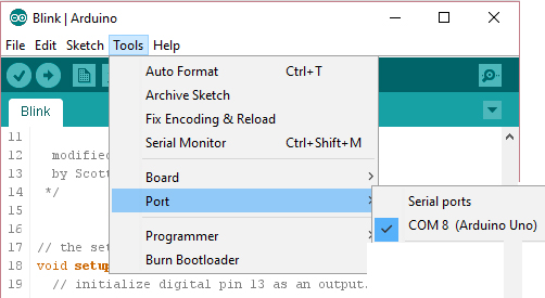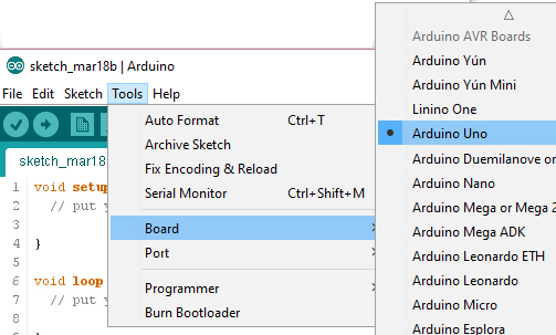 از لیست Tools، نوع برد آردوینو و پورت ارتباطی کامپیوتر را انتخاب کنید.