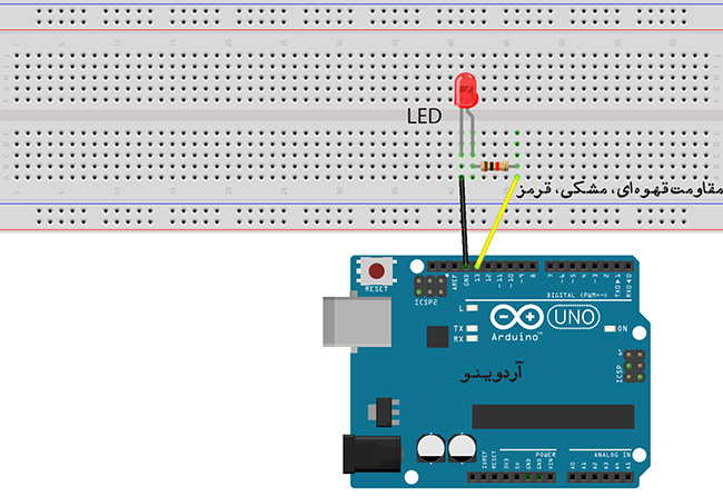 پایه مثبت LED به پین 13 آردوینو و پایه منفی LED به پین منفی (GND) آردوینو وصل میشود.
