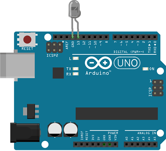 میتوانید LED را مستقیما به پینهای آردوینو وصل کنید (پایه مثبت LED به پین 13 و پایه منفی LED به پین GND). استفاده از مقاومت الزامی نیست: